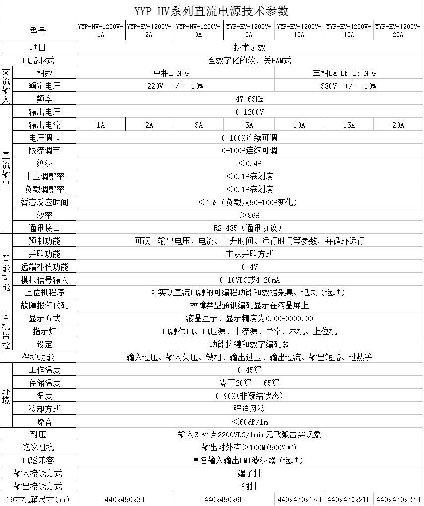 YYP系列直流电源采用全数字的PWM软开关技术,具有智能化、高功率密度、响应速度快、输出精度高、保护功能完整和指示状态数字化等优点;输出容量从1KW-200KW可选,采用19寸标准机柜,可根据客户要求定制;